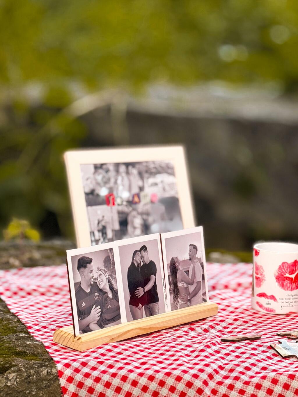 O Quadro - Trio de fotos é composto por 3 placas de MDF medindo 10x12 cm, fixadas em uma base inclinada de madeira pinus de 30 cm. Ideal para exibir suas fotos favoritas com um toque rústico e elegante.